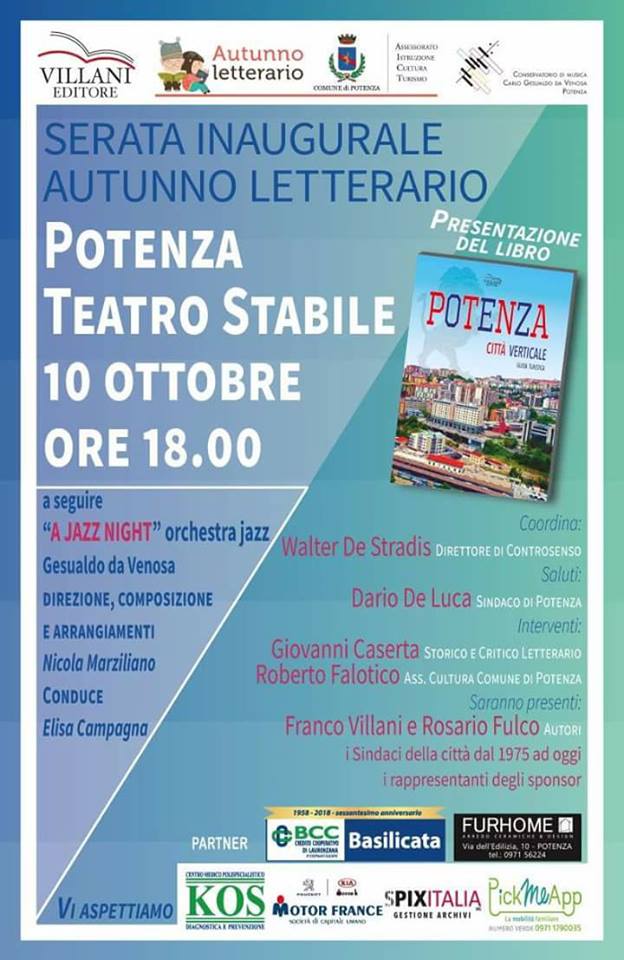 Serata inaugurale dell’autunno letterario con la presentazione del libro di Franco Villani “Potenza, città verticale” ore 18.00 e a seguire il concerto “A jazz night” a cura dell’orchestra jazz del Conservatorio “Gesualdo da Venosa” ore 20.00.