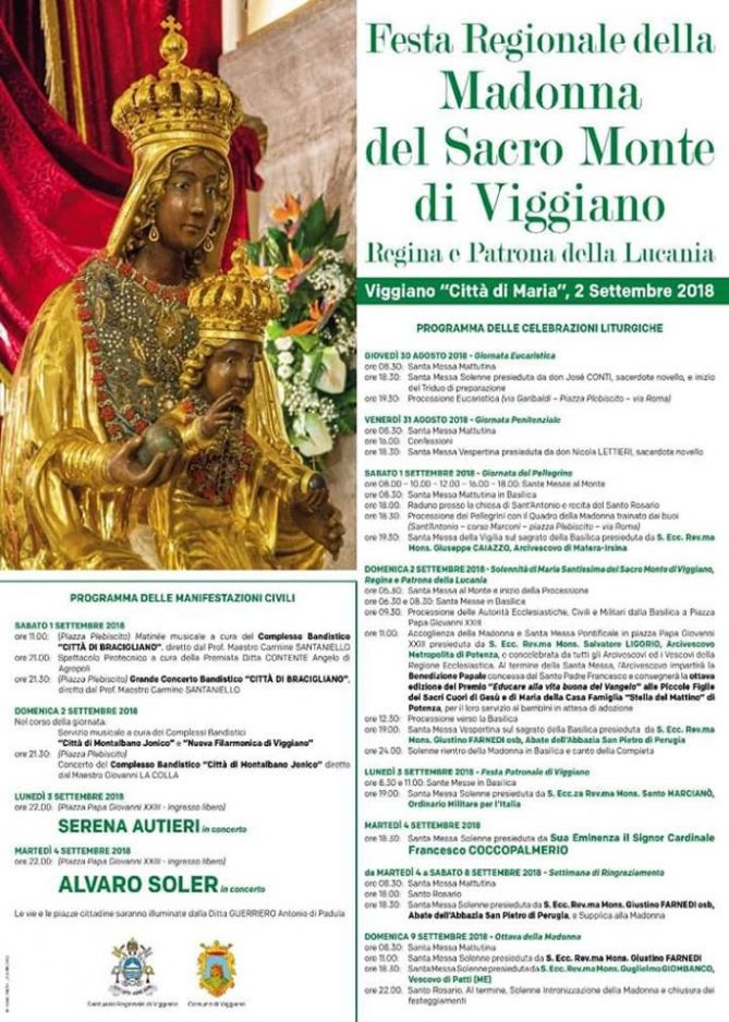 Il momento centrale della manifestazione sarà l’accoglienza della Madonna domenica alle 11.00 in Piazza Papa Giovanni XXIII, seguita dalla solenne messa pontificale presieduta dall’ Arcivescovo Metropolita di Potenza, Sua Eccellenza Rev.ma Mons. Salvatore Ligorio, e concelebrata da tutti gli Arcivescovi ed i Vescovi della Regione Ecclesiastica.