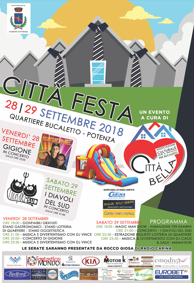 CITTA’ FESTA _ prima edizione_ festa di quartiere BUCALETTO a POTENZA dal 28 al 29 SETTEMBRE a cura di Città Bella associazione culturale sport e spettacolo per Bucaletto.