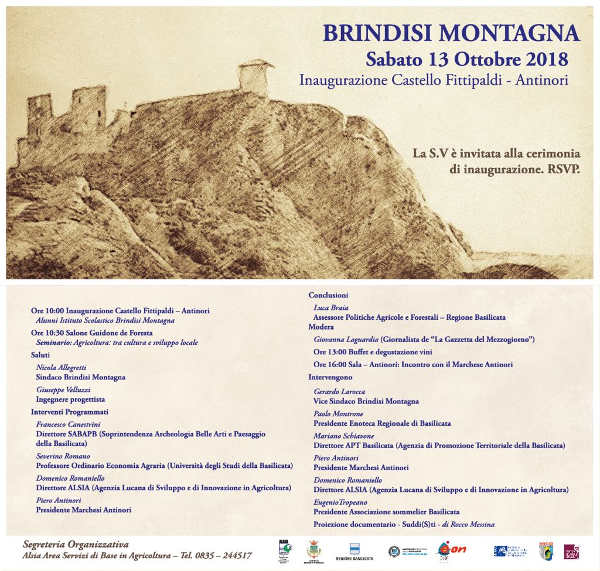 Dopo anni di attesa il castello Fittipaldi-Antinori di Brindisi di Montagna (Potenza) riapre al pubblico con una cerimonia di inaugurazione che si terrà sabato 13 ottobre a partire dalle ore 10.00 nella sala intitolata a Guidone de Foresta con la partecipazione degli alunni dell’istituto scolastico.”
