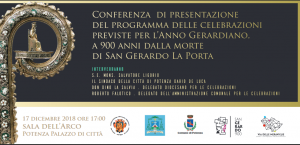Saranno il Sindaco di Potenza Dario De Luca, l ‘ assessore alla Cultura Roberto Falotico, L’Arcivescovo della diocesi di Potenza-Muro Lucano-Marsico Nuovo, monsignor Salvatore Ligorio e don Dino Lasalvia a presentare ufficialmente il programma delle celebrazioni previste per l’Anno Gerardiano, a 900 anni dalla morte di San Gerardo La Porta.
