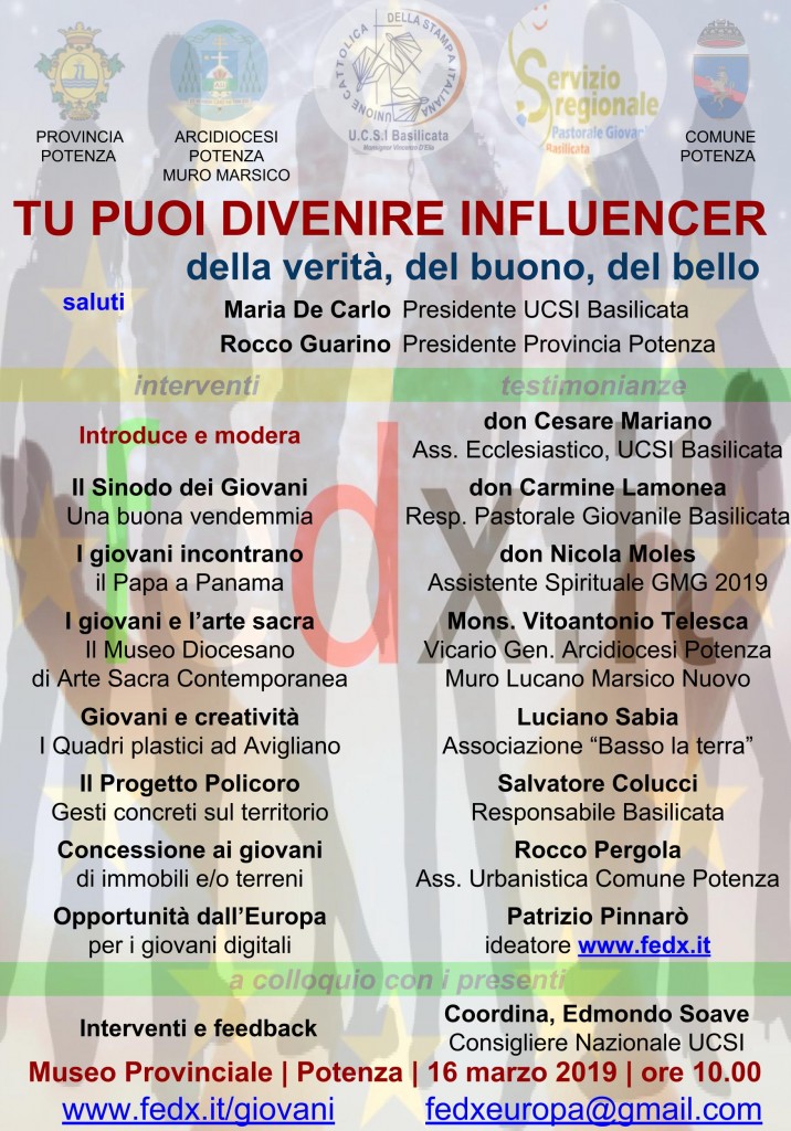 L’incontro è promosso in collaborazione con la Borsa Europea dei Fondi Diretti fedx.it , l’Arcidiocesi di Potenza – Muro Lucano – Marsico Nuovo, la Provincia di Potenza ed il Comune di Potenza.