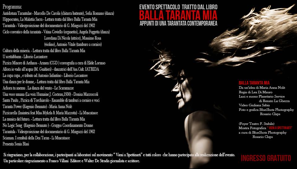 All’interno del prestigioso cartellone culturale del Maggio Potentino, il prossimo 31 maggio si svolgerà l’anteprima nazionale della prima edizione di “Balla Taranta Mia”: un suggestivo evento in musica, di teatro e danza popolare, tratto dal libro “Balla Taranta Mia. Appunti di una tarantata contemporanea”, di Maria Anna Nolè (Villani editore) pubblicato lo scorso 14 aprile.